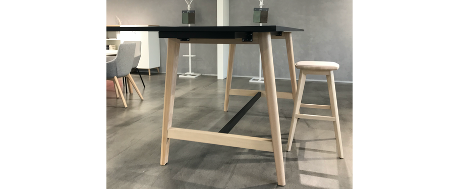 Vysoký konferenčný stôl, konštrukcia podnože s drevenými nohami z prírodného masívu (jaseňové drevo s prírodným odtieňom, priznané letokruhy, povrchovo ošetrené bezfarebným lakovaním), vrchný nosný rám z dvojice pozdĺžnych kovových nosníkov 40 x 20 x 2 mm, vzájomne spojené skrutkovým spojom. Stolová doska stola z LTD hr. 25 mm, obojstranné dyhovanie, hrana ABS 2 mm, farebný dekór: biela, dub alebo exkluzívny materiál Topmatt PerfectSense Black, ktorý má mimoriadne matný povrch a na dotyk je jemne sametový, vyznačuje sa dobrou odolnosťou voči zanechávaniu odtlačkov prstov, má odolnosť voči poškriabaniu, nárazu a namáhaniu pri používani v kancelárskych a konferenčných priestoroch. Výšková rektifikácia 0-15 mm pre vyrovnanie drobných nerovností na podlahe. Stôl je dodávaný v demonte, montážny materiál je súčasťou balenia.